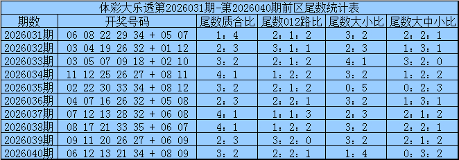 体彩大乐透第2026040期开奖号码为:06 12 13 21 34 + 08 09其中前区奖号奇偶比为2:3,大小比为2:3,012路为3:2:0,前区尾数质合比为3:2,012路比为2:2:1,大小比为1:4,大中小比0:3:2。